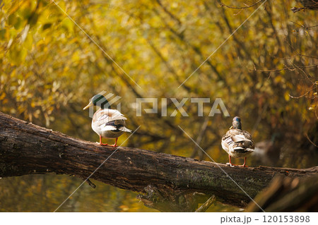 Two ducks perched gracefully on a fallen log by the shimmering stream in golden autumn foliage