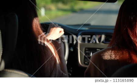 dancing girls driving car. travel machine. vacation sunset, holidays, holidays vacation., sitting front seat, women sitting front seat, girls playing car, two happy girlfriends working as team, young