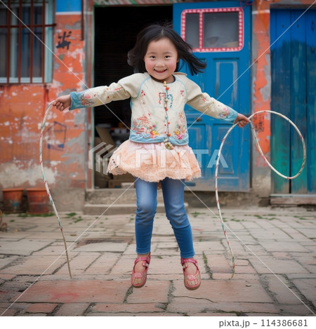 Young girl skipping rope with a joyful expression in a colorful setting.