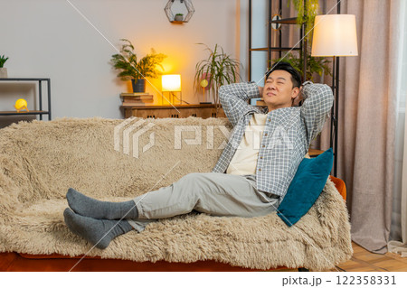 Happy carefree middle-aged Chinese man sitting comfortably on sofa thinking in living room at home