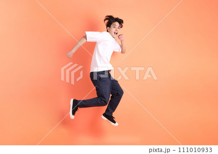 Man, jump and dance in the air for happiness with action, movement and balance of body isolated on white studio background. Male ballet dancer, happy and free with energy or dancing to music for fun