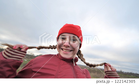 Cheerful teenage girl with braided hair laughing outdoors, wearing bright red top against soft cloudy landscape background