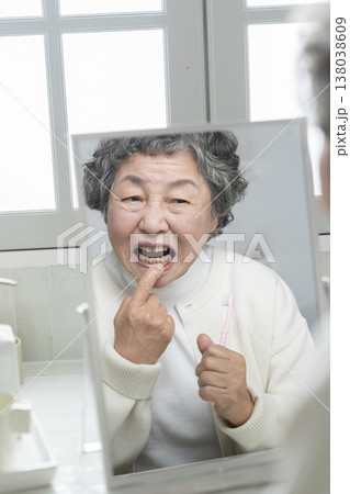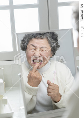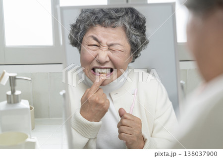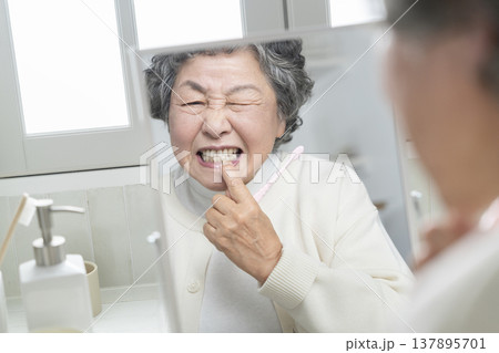 口腔内のトラブルイメージ 鏡を見て顔をしかめるシニア女性