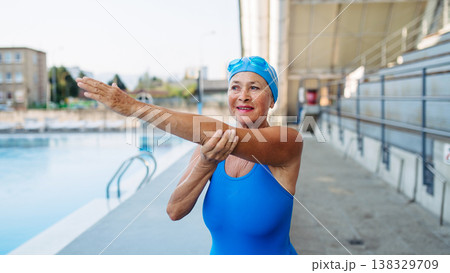 Elderly woman in swimming pool. Older female exercising for vitality and longevity.