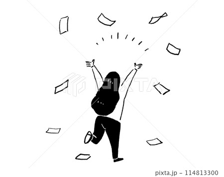 舞い上がるお金と手を上げて喜ぶ女性の後ろ姿、モノクロ