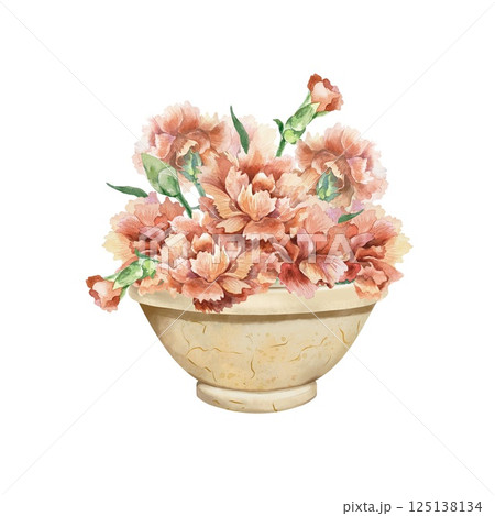 Red carnations, bouquet in ceramic vase. Hand drawn watercolor illustration isolated on white. For greeting cards for Victory Day, Revolution, Mothers Day, invitations, banners, posters.