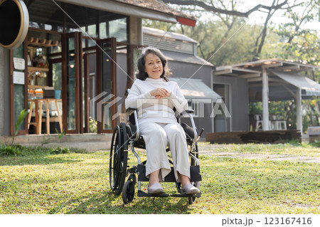 Elderly Woman Enjoying Outdoors in Wheelchair Near Modern House on a Sunny Day