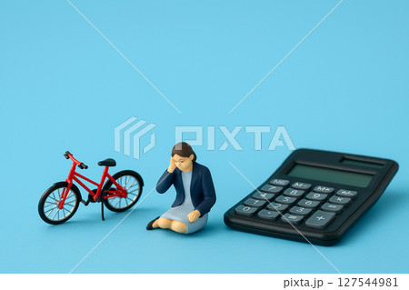 自転車通勤するミニチュア女性と電卓|交通費の節約や自転車保険の見直しイメージ