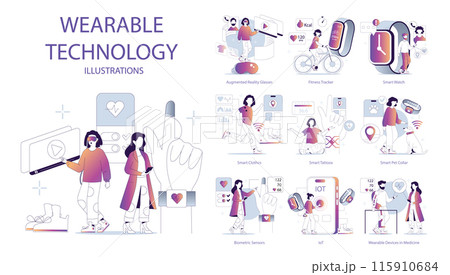 Wearable Technology set. Diverse devices integrating daily life. Health monitoring, fitness tracking, and IoT connectivity. Smart apparel and accessories. Vector illustration.