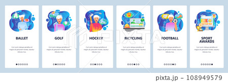 Mobile app onboarding screens. Sport players, ballet, football, golf, ice hockey. Menu vector banner template for website and mobile development. Web site design flat illustration