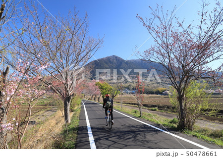 菜の花や桜咲くつくば霞ヶ浦りんりんロードを走るサイクリスト