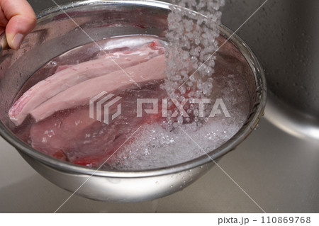 【ビールで下処理したレバニラ炒めの豚レバーを流水で洗う】