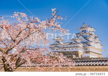 (兵庫県)世界遺産 姫路城 満開の桜、西の丸から望む天守