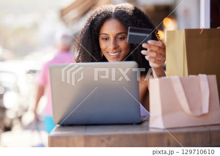 Credit card, laptop and woman in city online shopping, e commerce and fintech for fashion marketing, advertising and promotion sales. Black woman on digital e commerce website for finance banking app