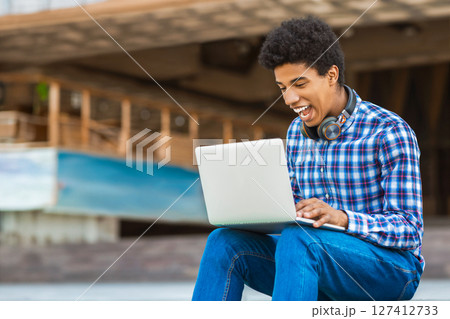 A teen African American guy with headphones around his neck sits outside and uses a laptop computer while smiling, copy space