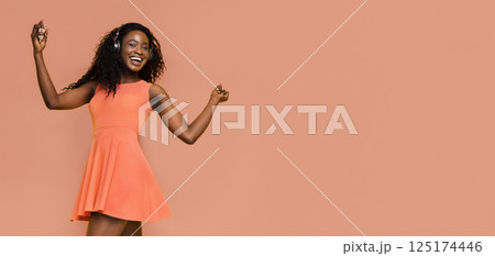 A young African American woman with long, curly black hair is wearing a bright orange dress. She is smiling and dancing with headphones on while standing in front of a peach-colored background.