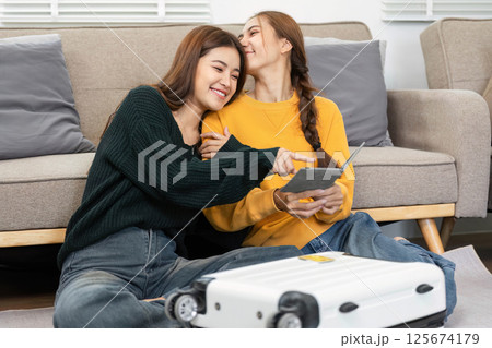 Wellness and togetherness: Women cuddling while reviewing travel details