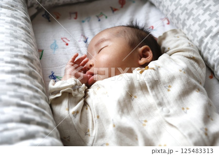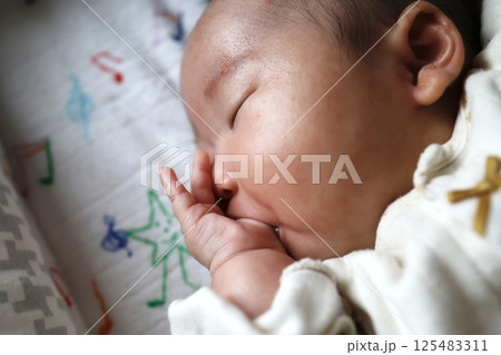 指しゃぶりをしている生後二ヶ月の赤ちゃん