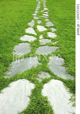 Landscaped garden path made of natural rough stone overgrown with grass on a summer green lawn in the backyard, nobody.