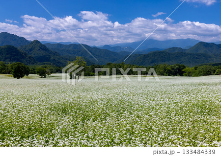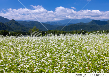 福島県南会津郡南会津町八総 舘岩地域の高杖原地区に広がるたかつえそば畑上段の白い蕎麦の花と夏の青空