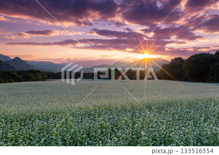 福島県南会津郡南会津町八総 舘岩地域の高杖原地区に広がるたかつえそば畑の白い蕎麦の花と夕焼け空