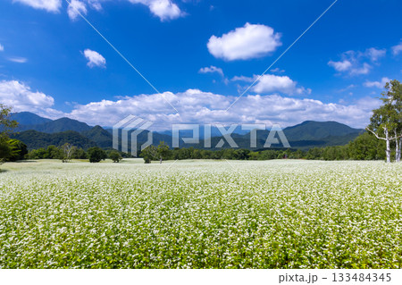 福島県南会津郡南会津町八総 舘岩地域の高杖原地区に広がるたかつえそば畑の白い蕎麦の花と夏の青空