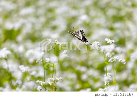 福島県南会津郡南会津町八総 舘岩地域の高杖原地区に広がるたかつえそば畑の白い蕎麦の花とアゲハチョウ