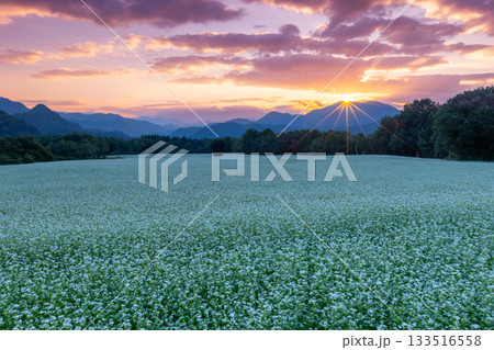 福島県南会津郡南会津町八総 舘岩地域の高杖原地区に広がるたかつえそば畑の白い蕎麦の花と夕陽