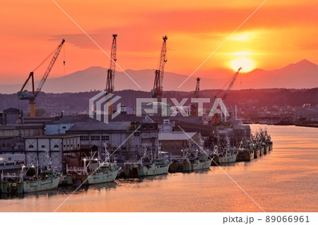 舘鼻公園から観る夕焼けと八戸魚市場(青森県八戸市)