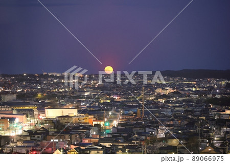 八戸街の向こうから満月が出てくる(青森県八戸市)
