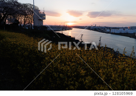 舘鼻公園の菜の花と夕焼けの馬淵川(青森県八戸市)