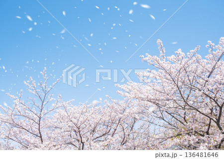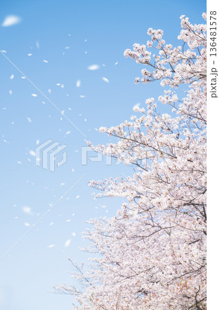桜の木と青空に舞う桜の花びら 青空と桜吹雪 (4月)