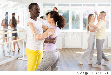 Smiling young woman wearing sportswear dancing in couple rumba dance with african american partner during group class at dance salon