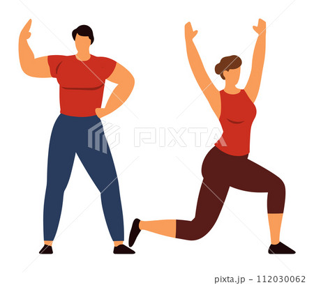 Adult woman doing yoga man dancing, fitness workout. People exercising, healthy lifestyle concept. Active adults sportswear vector illustration