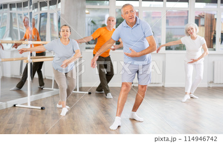 Elderly man ballet dancer executing ballet movements with group of older men and women in choreography studio