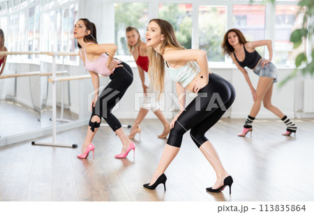 Female dancer practicing jazz-funk dance moves in high heels in studio