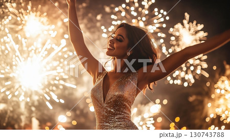 Young woman in an elegant dress is joyfully dancing with her arms raised against a backdrop of exploding fireworks