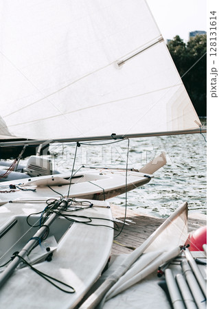 Close up white dinghy with rigged sail and control lines moored at wooden dock on sunny lake