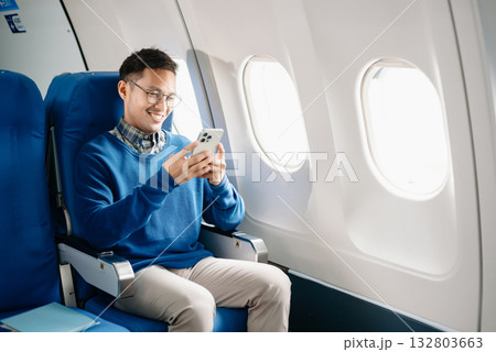 Asian man sitting in a seat in airplane and looking out the window going on a trip vacation travel concept. using a phone, laptop with grace.Capture the allure