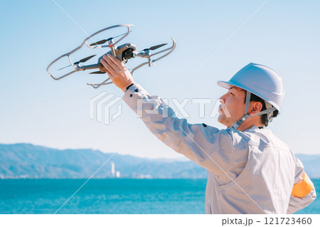 ドローンを操縦する作業員