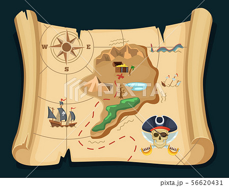 Old treasure map for pirate adventures. Island with old chest. Vector illustration