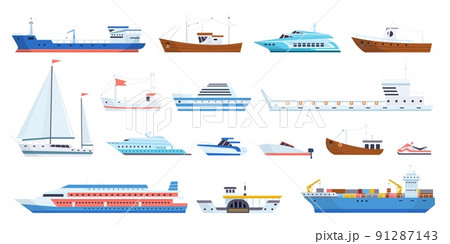 Big and little sea ships. Fishing boat cruise liner sail yacht, barge transporting ship types, ocean transport tanker sailboat steamboat motor vessel, neoteric vector illustration