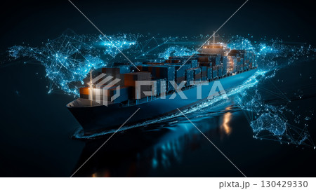 海上の物流船とデジタルテクノロジーが融合したビジュアル
