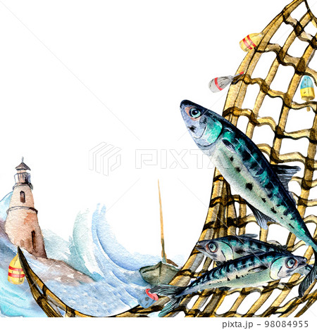 Composition of mackerel and seascape watercolor illustration isolated on white.