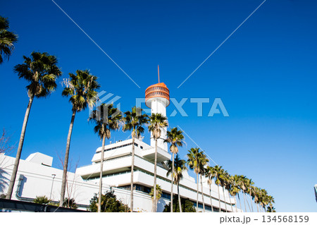 真っ青な青空とまぶしい日差しの下の白壁とオレンジ色の展望台の船の科学館の建物