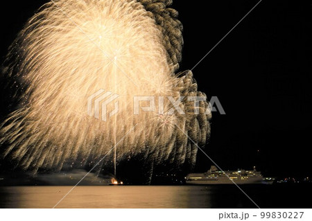 夏の小豆島、瀬戸内海、豪華客船のクルーズ、そして海上にあがる花火
