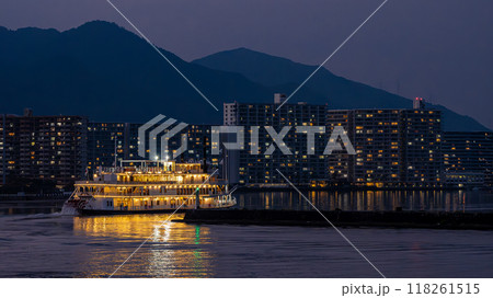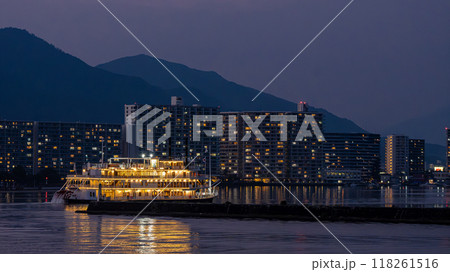 夜の大津港を出港する観光船ミシガン ナイトクルーズ