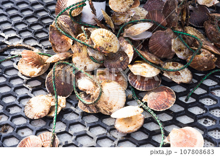 たくさんの牡蠣養殖用の帆立の貝殻