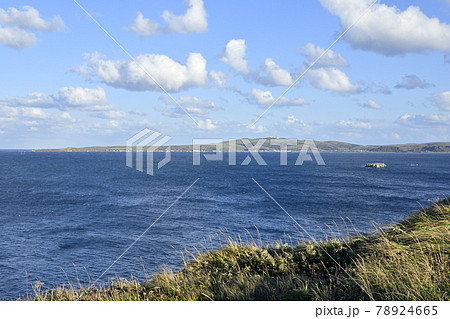 礼文島 金田ノ岬から荒波の船泊湾越しのスコタン岬とトド島
