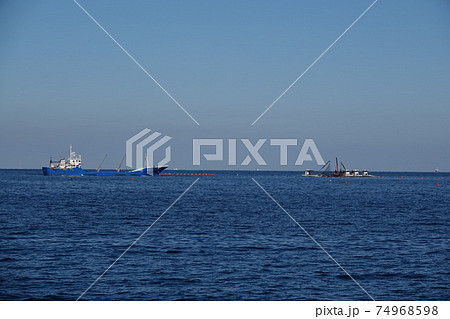 灘沖で作業する大型クレーン付き漁船